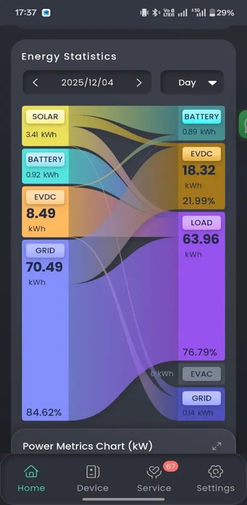 De app toont een duidelijk overzicht van alle energiestromen: van links (zonnepanelen, batterij, net) naar rechts (EVDC-laden, gebouwconsumptie, batterij laden, export). Wanneer “Grid → Output” 0 kWh toont, betekent dit dat er netto geen energie naar het net ging over die periode.